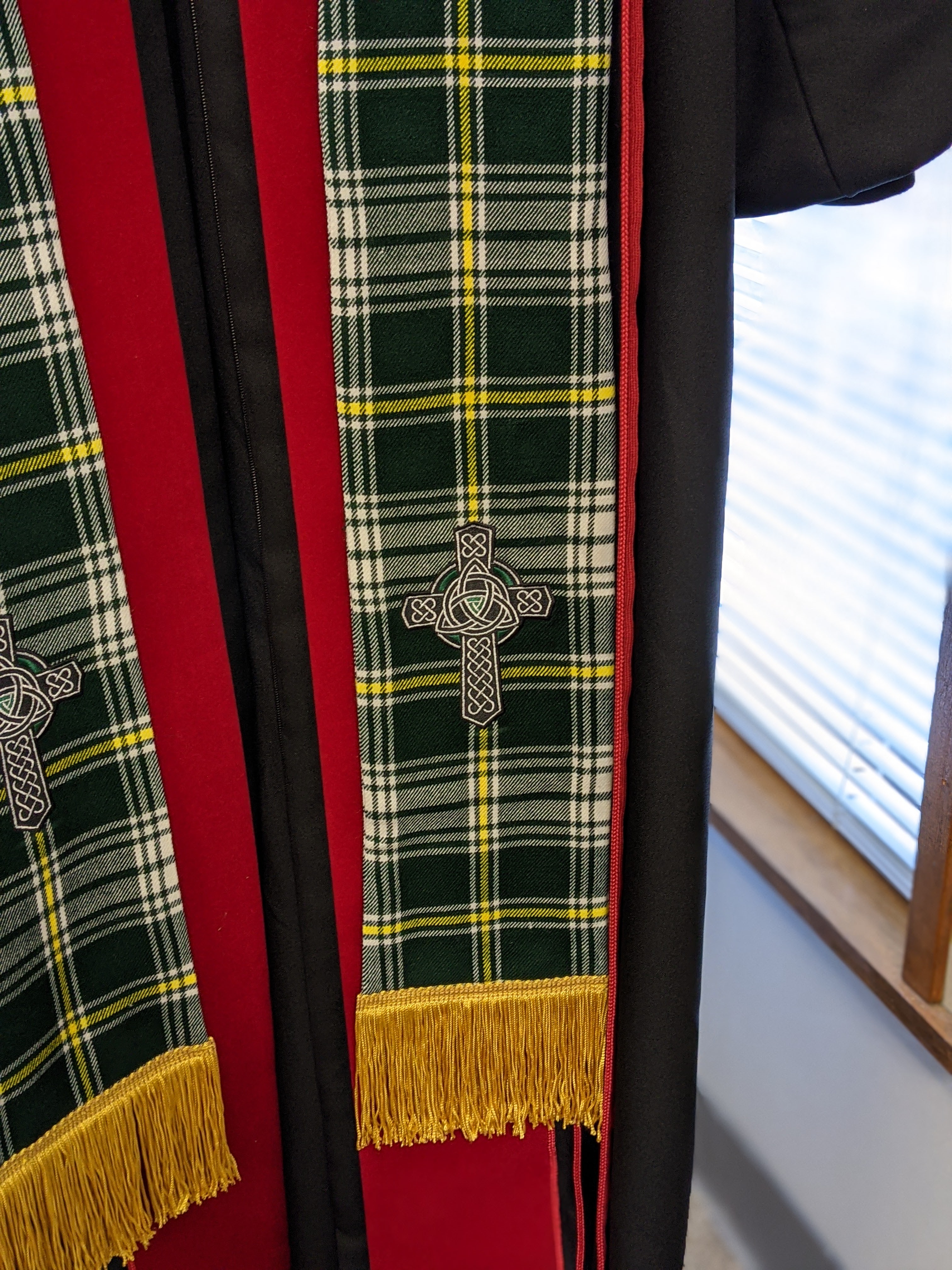 The Habit of the Order of St. Patrick consists of a white alb and brown belt for Novitiates. The Habit for Full Members consists of a white alb, tartan cowl, and brown belt. The alb and belt can be ordered individually from any number of vendors. The cowl is custom made by a member of the Order, and can be ordered below. OSP tartan stoles are also available. Order either by clicking on the links below.